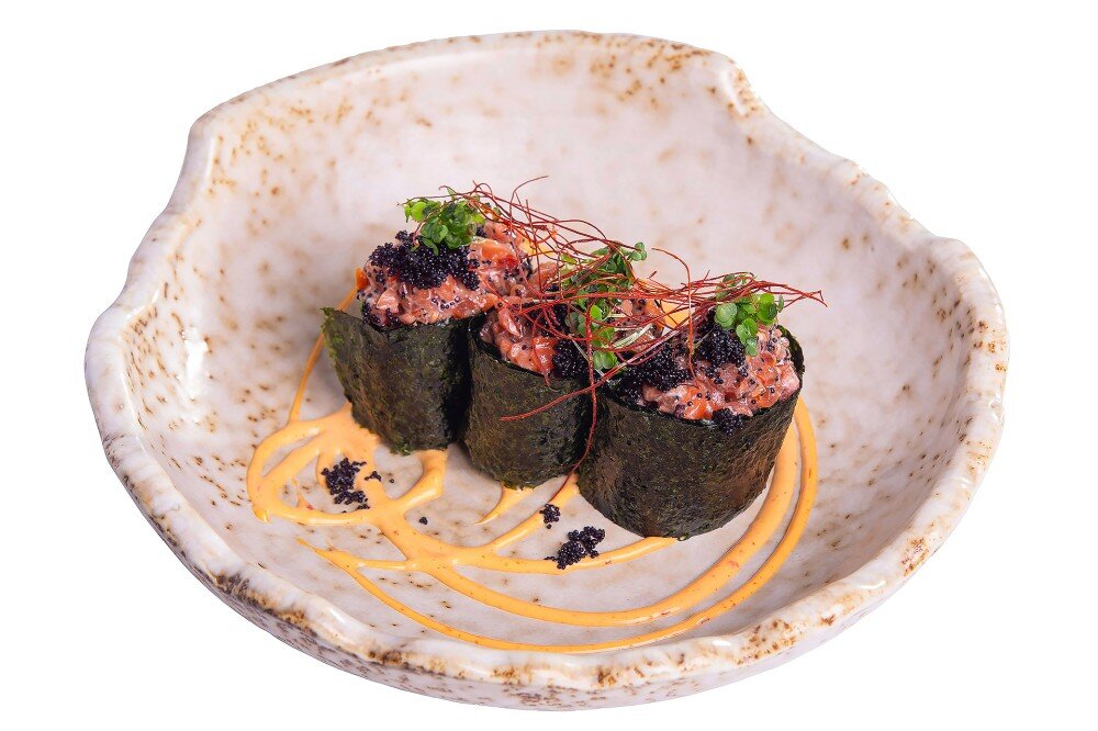 Рис для суши , лосось , томаты черри , икра летучей рыбы