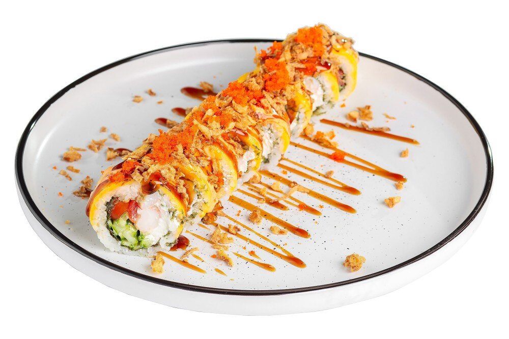 Рис для суши , водоросли нори, сыр творожный, томат черри , королевская креветка , огурец свежий , сыр чеддер , пряный соус (спайси) , соус терияки , жаренный лук , икра летучей рыбы