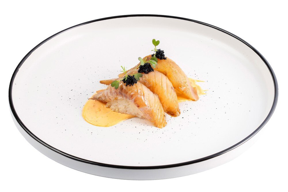 Рис для суши, окунь морской маринованный, васаби, соус никири, икра летучей рыбы.
