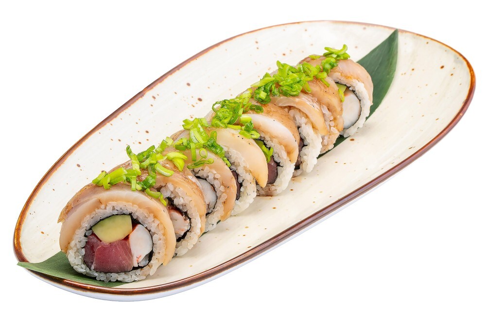 Рис для суши, водоросли нори, окунь морской маринованный, тунец елоуфин, авокадо, креветка королевская, лук зеленый, соус юдзу.