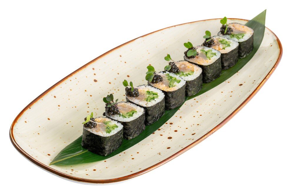Рис для суши, водоросли нори, окунь морской маринованный, соус пряный (спайси), огурец свежий.