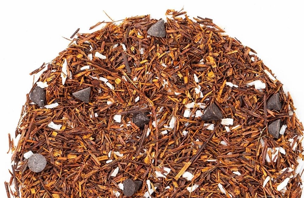 Чай Ройбос (Ройбос) — это уникальный напиток, получаемый из кустарника Aspalathus linearis, который произрастает в Южной Африке. Листья и побеги этого растения используются для приготовления чая, который обладает ярким ароматом и насыщенным вкусом. Ройбос известен своими полезными свойствами, включая улучшение сна, снижение уровня стресса и поддержание здоровья сердца. Он также содержит витамины и антиоксиданты, что делает его популярным как альтернативу обычному чая.Чай с кусочками шоколада и кокоса.